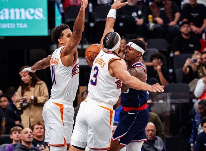 更何况,哈登也不是场场都能轰下30分,比尔的存在正是为了分担哈登的压力,未来他的侵略性必将逐步提升。比尔过去两个赛季在太阳的风评跌至谷底,原因并非他能力不足,而是太阳队的体系完全不适合他。比尔是得分后卫,布克同样是得分后卫,杜兰特更是终极进攻点。太阳缺乏一名靠谱的组织核心,导致比尔被反复折腾——一会儿被推上控卫位置,一会儿又被安排打小前锋,角色混乱让他无所适从。相比之下,快船的体系为比尔提供了完美的舞台。哈登的组织能力远超当年的沃尔,两人完全不在一个量级。哈登的传球视野、进攻威胁以及无私的打法,让比尔仿佛回到了奇才时期,与巅峰沃尔搭档的舒适感。