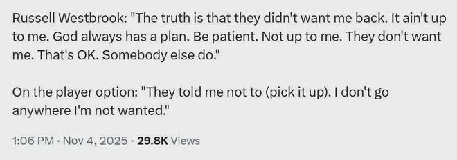 据威少本人的说法,是掘金不想让他回来,其也不愿待在一个不需要自己的队伍,所以就分道扬镳了......