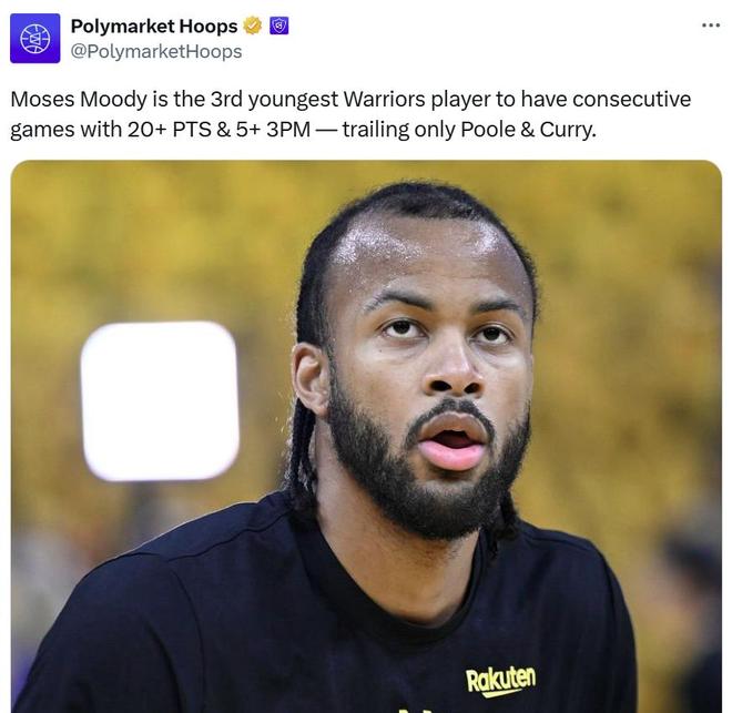 凭借这样的表现,23岁159天的穆迪成为勇士队史连场砍下至少20分+5记三分第三年轻的球员,前二分别是库里和普尔,上一场对阵太阳穆迪也有24分+5记三分入账。