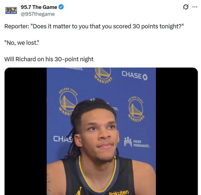 更加值得夸赞的是,在交出这样的表现后,赛后被问到单场拿下30分对自己是否重要时,理查德摇头说道:“不,我们输球了。”
