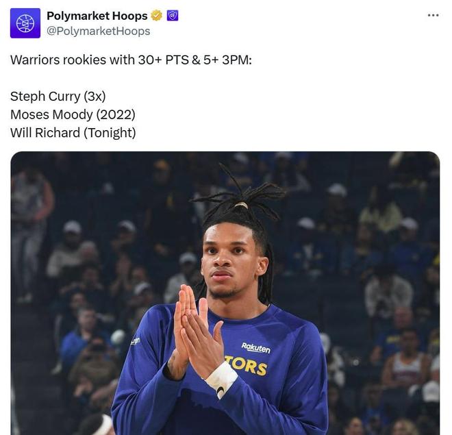 如果算上命中5记三分,理查德成为勇士队史第三位在新秀赛季交出30+5记三分表现的球员,前两人分别是穆迪与库里(3次)。
